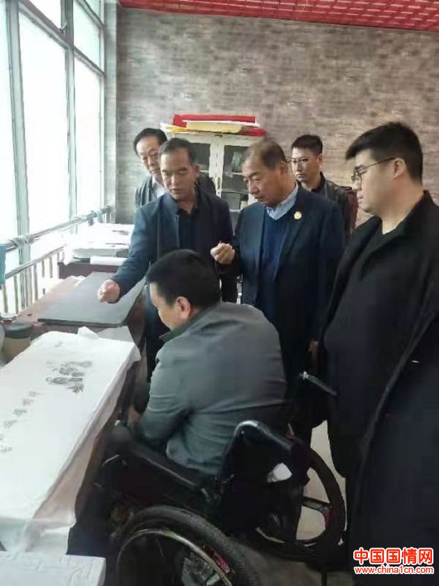 余延庆主任先后视察了该中心残疾人金石传拓培训班、传统装裱培训班、文化创意基地和残疾人作品陈列室。在传拓教室,余主任还饶有兴趣地询问了传拓作品的制作过程,对残疾朋友们自强创业精神表示肯定和赞赏。