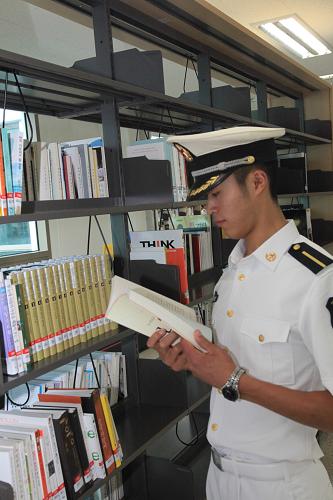 8月5日,随中国人民解放军海军郑和舰到访韩国镇海的海军大连舰艇学院学员参观韩国海军军官学校图书馆。新华社发(李铸峰摄)