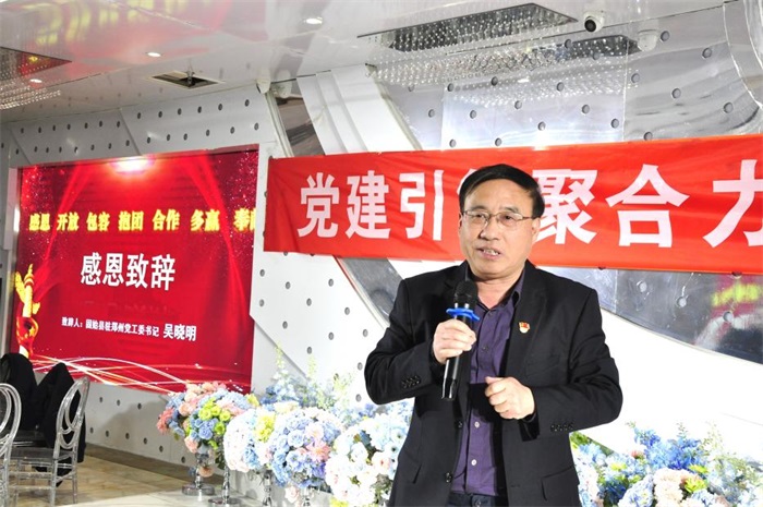 固始县驻郑州党工委书记吴晓明同志最后做感恩讲话。他从感恩、开放、包容、抱团、合作、多赢、奉献等几个方面,重点讲到要真抓党建激发活力,大抓党建增强实力,狠抓党建挖掘潜力。