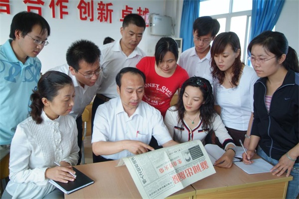 李佩山(中)向中铁十四局集团新闻培训班的学员们介绍蒙标成的故事,后排左二为杜晓言。张阳灿 摄