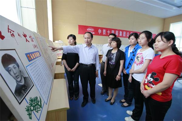 中铁十四局集团宣传骨干培训班的学员们,听李佩山(左二)讲《生命的火焰》背后的故事。杨德政 摄