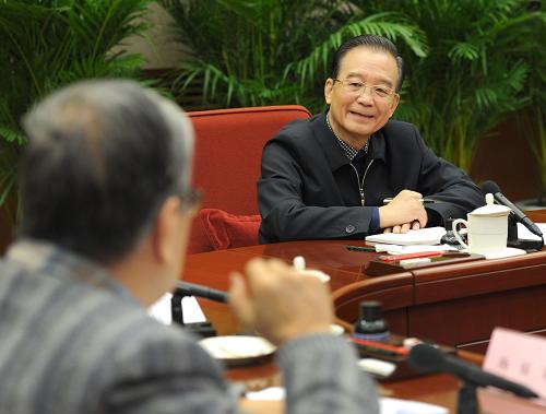 | 这是2月7日,温家宝听取科技、教育、卫生、文化、体育界人士对《政府工作报告(征求意见稿)》的意见和建议。新华社记者 马占成 摄 |