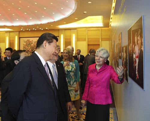 6月3日,国家副主席习近平在北京钓鱼台国宾馆会见美国艾奥瓦州州长布兰斯塔德率领的友好代表团。这是会见结束后,习近平陪同代表团成员观看他今年2月访问艾奥瓦州时与该代表团部分成员交流的图片。新华社记者 兰红光 摄