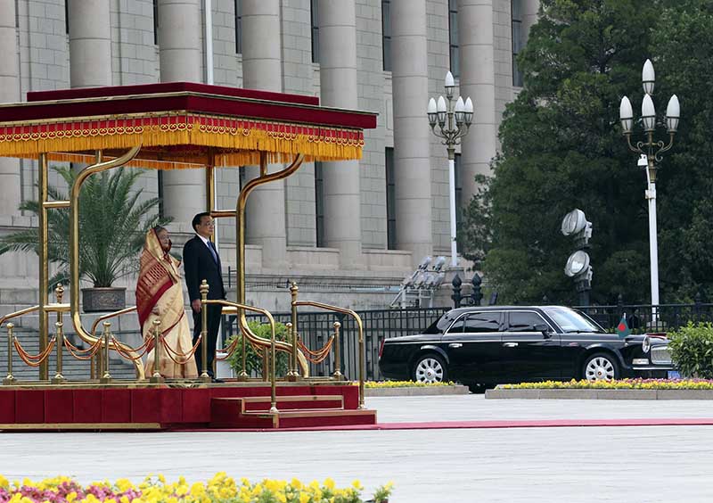 6月9日,国务院总理李克强在北京人民大会堂同孟加拉国总理哈西娜举行会谈。这是会谈前,李克强在人民大会堂东门外广场为哈西娜举行欢迎仪式。新华社记者 丁林 摄