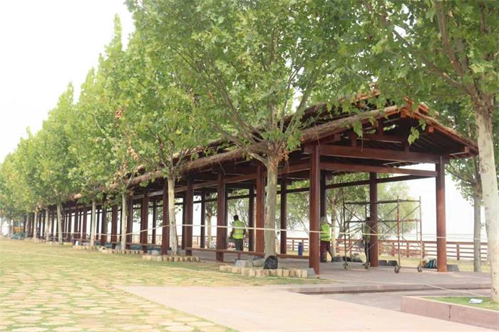 项目打造的重檐茅草长廊、360 平米海事驿站等核心建筑,均采用传统梁柱榫卯结构,主体连接无钉化,可重复拆卸,既契合生态建设 “轻介入、可循环” 的理念,又为后续功能调整预留了灵活空间。选材上,觅庭精选耐腐蚀性强、性价比高的菠萝格防腐木,其稳定性、抗潮湿、抗白蚁特性完美适配户外严苛环境;墙体则采用黄河流域古法夯土墙加茅草的工艺,就地取材降低建设成本,更保留了黄河本土的传统建筑特色。