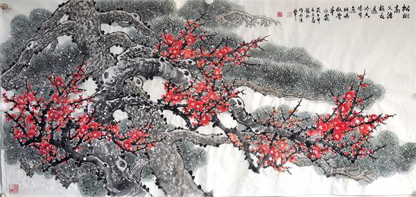 梅花具有不畏严寒品格,松具有极其顽强的生命力。他把梅、松、创作呈现在一幅作品上与郭银明曾是军人的缘由吧,也是内心深处的品格、才能赋予他准确的笔墨语言表现的人文精神,郭银明平时十分注重实地采风写生,在创作中他认为有几点需要把握;其一,花朵不在多,但浓与谈,大与小,疏与密的关系要照应到;其二出枝不在奇,但枝干的穿插、粗细、曲直、干湿应有变化;其三,手高不在快,画即需要着眼整体的视觉效果,又要关注局部的一枝一花,其四,点梅穿枝要有呼应交融,谓之;画龙点睛;,此时达到视觉效果的关健环节。