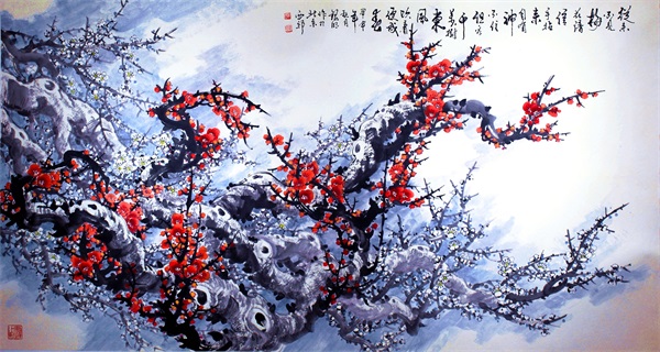 郭银明的花鸟画创作系列梳理了中国花鸟画的历史沿革、工具、材料、基本技法、临摹、写生、创作、题款、钤印等等,并总结了他多年花鸟画创作的经验。他对梅花的分类及其结构、形态的分析尤为细致,创作已从技法层面提升到精神层面,追求一种诗性的升华。他精通中国花鸟画史、画论,从理论的高度把握中国花鸟画的精髓诗性和意境。他的梅花从创作实践中的角度继承了中国花鸟画表现诗性、意境的传统,追求着一种恬静悠远、深邃含蓄的意境。这和恬静悠,深邃含蓄的味道就是诗性或诗意。他梅花作品从立意、构图到笔墨、色彩,无不体现出符合当代人的审美情趣的清新诗意。