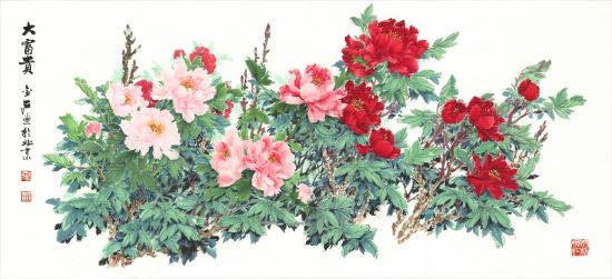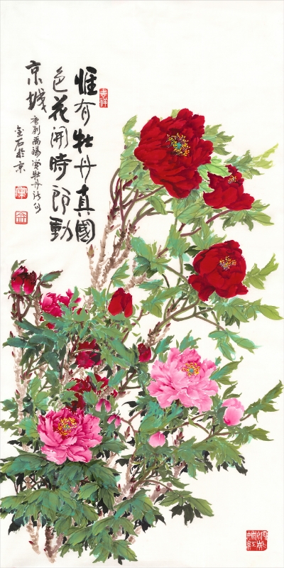 有人说,先生笔下的牡丹,藏着“万里云山春色”。细品确实如此:那牡丹不止是案头的娇妍,更似生长在云山幽径深处,村舍旁,石缝间。没有刻意的修饰,带着几分“无欲”的淡然,却偏在嫣红翠绿间让人耳目一新。那不是温室里的富贵花,是沾了山野灵气的仙子,风过处,似有衣袂翻飞,连空气都变得清甜。望着这样的画,心会不自觉地软下来,醉下来,忘了尘世的烦扰,只余下对自然与生命的敬畏。