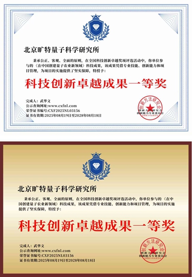 为表彰中国量子农业技术新突破,科技部主管的创新方法研究会特为其颁发奖牌。奖牌显示:在全国科技创新卓越奖项评选活动中,你单位参与的《在中国创建量子农业新领域》科研成果。该成果凭借专业技能、创新能力和项目管理,为项目的实施提供了坚实保障,特授予科技创新卓越成果一等奖。颁奖单位:创新方法研究会创新能力专业委员会。