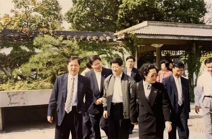 鹿金东(右一)陪同时任中共上海市委副书记孟建柱(右三)调研园林绿化工作